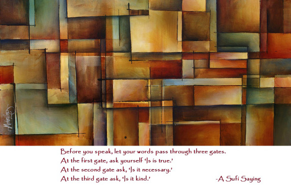 One way to cultivate the space between stimulus and response is by using a protocol made familiar by Quakers, Sufis and Buddhists alike, in the story of the three sieves, or the three gates of speech. Before we allow our words to pass through each of the three sieves or gates, we pause to ask these questions: Is what I’m about to say true? Is it kind? Is it necessary?